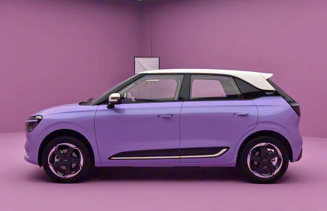 再来看车身侧面部分,车身侧面以短前后悬设计为核心亮点,在紧凑尺寸中实现空间最大化(具体长宽高未公开,轴距推测约 2500mm 级)。一条流畅的腰线从车头翼子板延伸至车尾,与微微内凹的车门线条、外凸的轮拱形成呼应,勾勒出类似 “健身线条” 的肌肉感,打破小型车的单薄印象。15 英寸五辐旋风轮毂为全系标配,黑色涂装搭配银色饰条,动感气息十足。最令人惊喜的是全系标配的无框车门,开关门时的仪式感堪比十万元以上车型,这在同价位纯电车中极为罕见。车顶行李架与可开启全景天窗的组合,进一步拓展实用场景,露营自驾时能轻松固定装备。